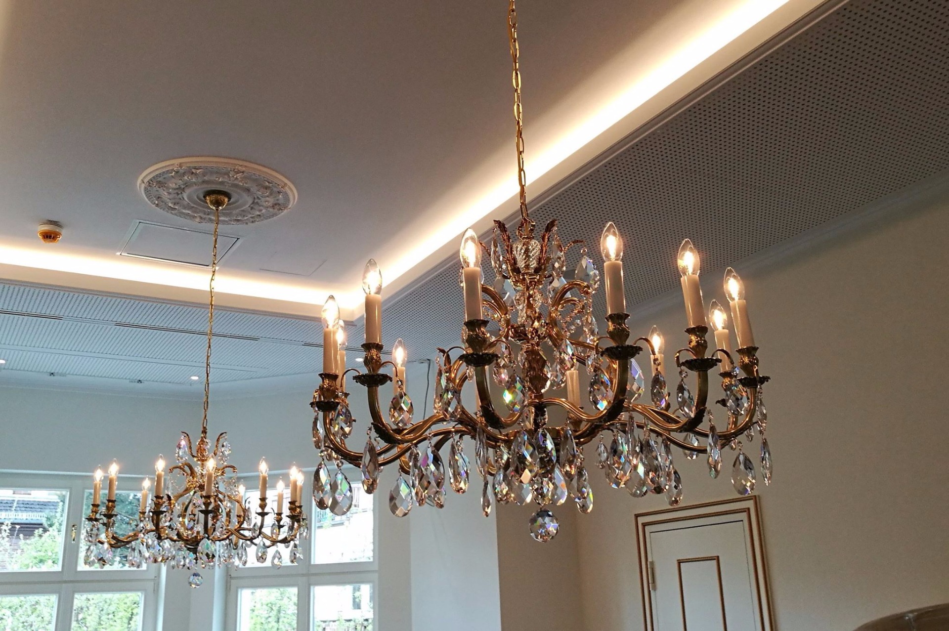фойе, гостиной и коридорах. Было установлено 17 люстр и 33 настенных